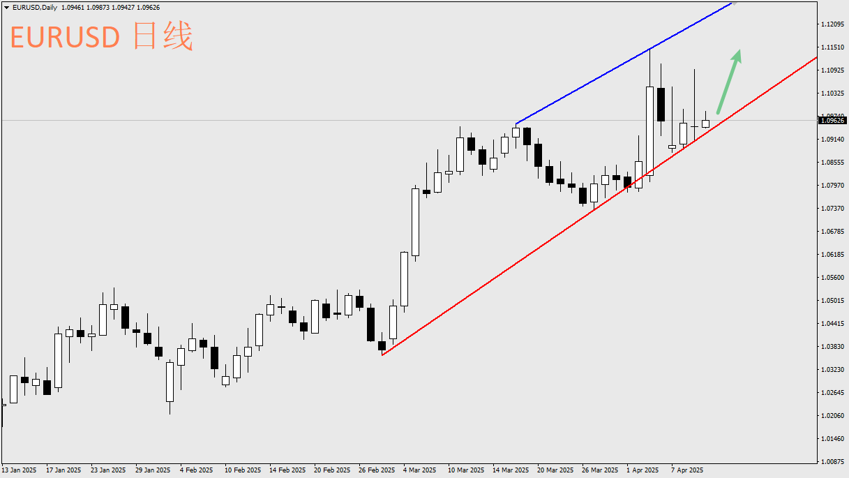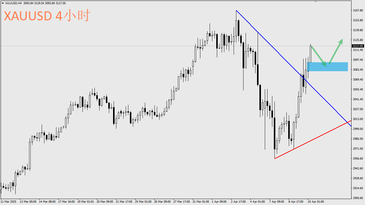 从早上开盘行情,所有亚洲股市普遍大幅反弹,澳洲股市涨超4%,日本股市涨超7%,韩国股市涨超5%,即使是当前与美国针锋相对的中国、香港股市,仍旧有1~3%不等以上的涨幅,这反映出昨天美股因特朗普贸易政策急转弯所释放的买盘海啸目前还在蔓延当中。而早盘的美元指数目前属于冲高回落的情况,以日线上来说,目前美元仍未摆脱偏空格局,103.2~103.5是可以关注的布局位置。