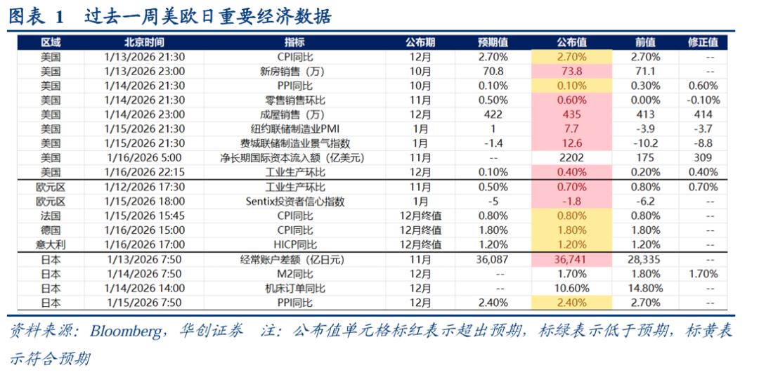 美国:多项数据超预期,包括新房销售、成屋销售;零售销售环比;纽约联储制造业PMI和费城联储制造业景气指数;工业生产环比。通胀则基本符合预期,包括CPI和PPI。