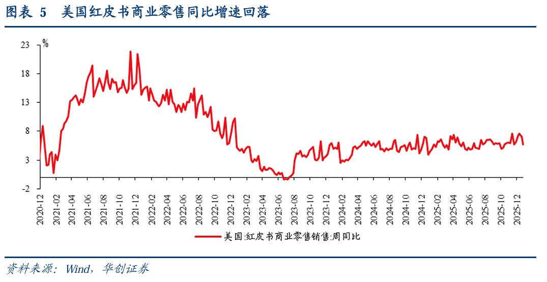 美国红皮书商业零售同比增速回落。 1 月 9 日当周,美国红皮书商业零售同比为 5.7% , 四周移动平均为 6.9% ; 前一周为 7.1% ,四周移动平均为 7.0% 。