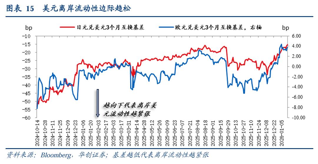 离岸美元流动性边际小幅宽松。1月16日,日元兑美元3个月互换基差为-15.4pips,一周前为-17pips;欧元兑美元3个月互换基差为3.75pips,一周前为3.25pips。