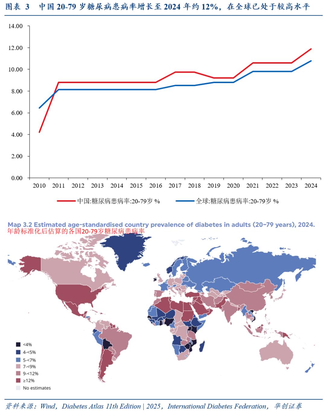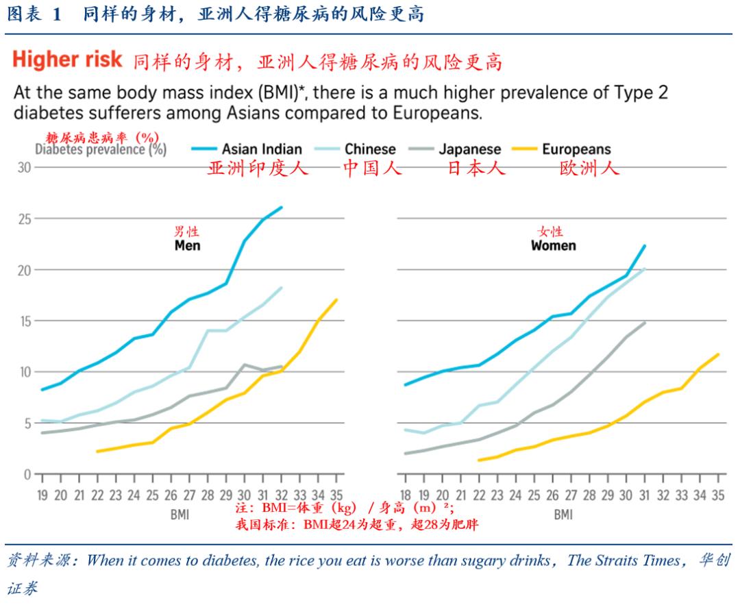 当代的糖税,特指对含糖饮料(Sugar-Sweetened Beverages,SSB)征收,消费群体是普通大众,主要目标是“寓禁于征”,更类似于烟草税:即通过税收引导居民健康消费,纠正市场中存在的外部成本,最终达到提高社会福利的目标——同样身材,亚洲人得糖尿病的风险更高(白米饭会使亚洲人的身体血糖超负荷,不必肥胖才有风险)2024年我国成年糖尿病患者相关支出已超万亿元,占GDP比重0.9%;20-79岁糖尿病患病率由2010年约4%增长至2024年约12%,在全球已处于较高水平。