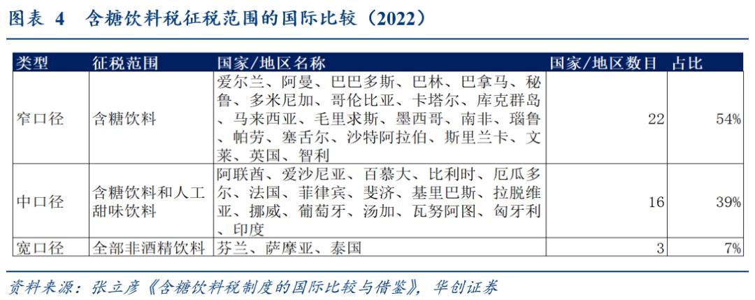 在海外,目前糖税的征税范围大致可分为窄口径、中口径和宽口径:窄口径仅对含糖饮料(包括部分或全部含糖饮料)征税(在实施含糖饮料税的国家中占比54%)。中口径指除对含糖饮料征税外,还对添加有人工甜味剂的饮料征税(在实施含糖饮料税的国家中占比39%)。宽口径指对全部含糖饮料、人工甜味剂饮料和其他饮料征税,即对所有非酒精饮料征税(在实施含糖饮料税的国家中占比7%)(张立彦,2022)。