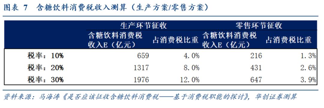 参考马海涛(2021)的方法,在对含糖饮料征收10%、20%和30%消费税的情境下,我们分别从生产环节和零售环节对含糖饮料消费税收入进行估算,10%~30%的糖税每年可以带来约700~2000亿(占消费税比重约4%~12%)、200~600亿税收增收(占消费税比重约1%~4%)。测算仅为学术探讨。