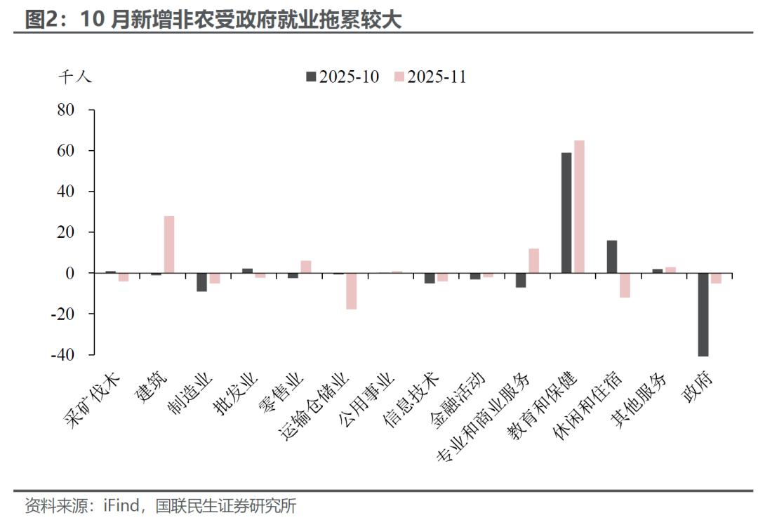 其一,10-11月新增非农就业显著回落,但政府部门是主要拖累项。11月联邦政府就业减少0.6万人,10月更是大幅缩减16.2万人,成为拖累就业的最大抓手,主要原因在于特朗普政府“延迟辞职计划”的影响(年初接受辞职提议的雇员将继续领取工资到9月底),这使得10万名以上的政府雇员在10月后陆续离职,成为非农下降最大的“技术性噪音”。