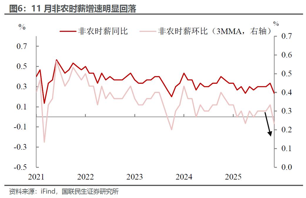 其三,薪资增速释放出降温信号,但趋势持续性仍待观察。11月平均时薪环比增长0.1%,同比则增长3.5%,为2021年5月以来最低增速,间接反映招聘市场活跃度下降。实际薪资增速下滑在一定程度上压缩了居民购买力,美国消费市场的“K型分化”特征正逐步加剧。不过,受数据搜集质量问题影响,薪资增速放缓能否形成稳定趋势,仍需后续数据验证。